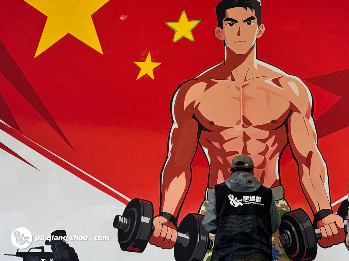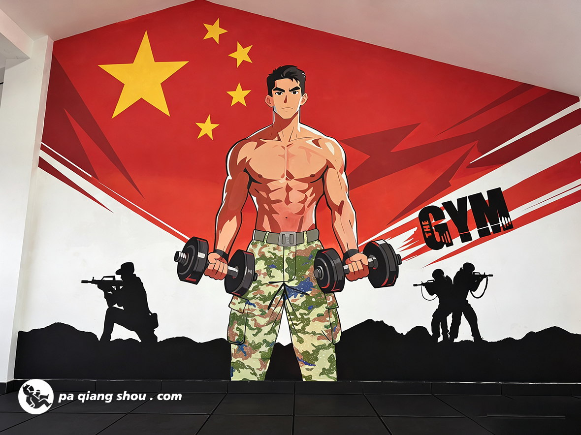 当迷彩与力量相遇,当艺术融入军营,一面面充满热血与斗志的墙绘,便在成都某部队的健身房里悄然绽放。我们用画笔为这片挥洒汗水的天地注入军魂,让每一次训练都更有力量,每一次突破都更有方向。走进这间军营健身房,目光所及皆是震撼。以中国红为底色的墙面上,肌肉线条硬朗的迷彩军人形象跃然眼前,他双手紧握杠铃,目光坚毅,仿佛在诉说着“永不放弃”的拼搏精神;另一侧,五星红旗与战士剪影交相辉映,将家国情怀与强军使命融入每一笔色彩。这些墙绘不仅是视觉上的震撼,更是精神上的激励,让战士们在训练时能时刻感受到使命在肩、热血沸腾。